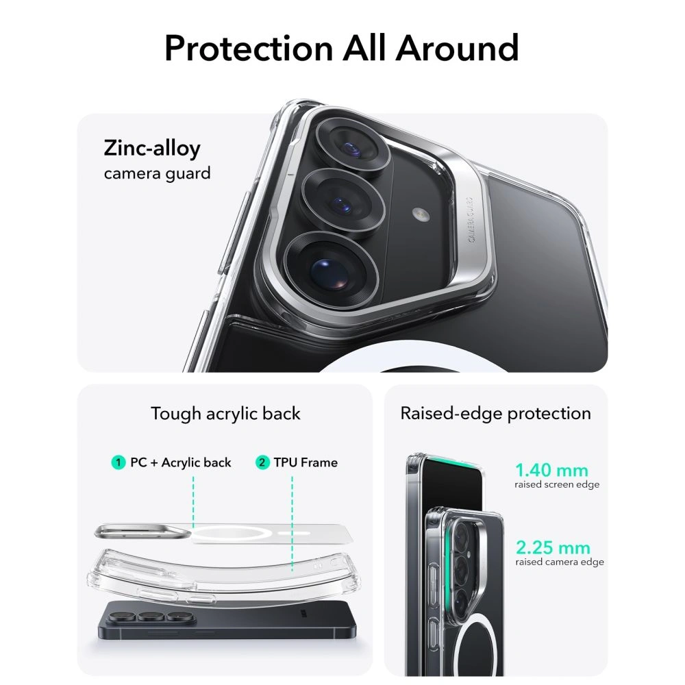 ESR Classic Hybrid Kickstand MagSafe to zaawansowane etui łączące ochronę z funkcjonalnością przy zachowaniu minimalistycznego, smukłego kształtu. Mocne plecki wykonane z poliwęglanu i akrylu w połączeniu z elastyczną ramką TPU zapewniają solidną ochronę, nie pogrubiając telefonu ani nie odbierając mu uroku. Wzmocnione narożniki skutecznie absorbują uderzenia, zamieniając potencjalne upadki w element codziennego użytkowania.