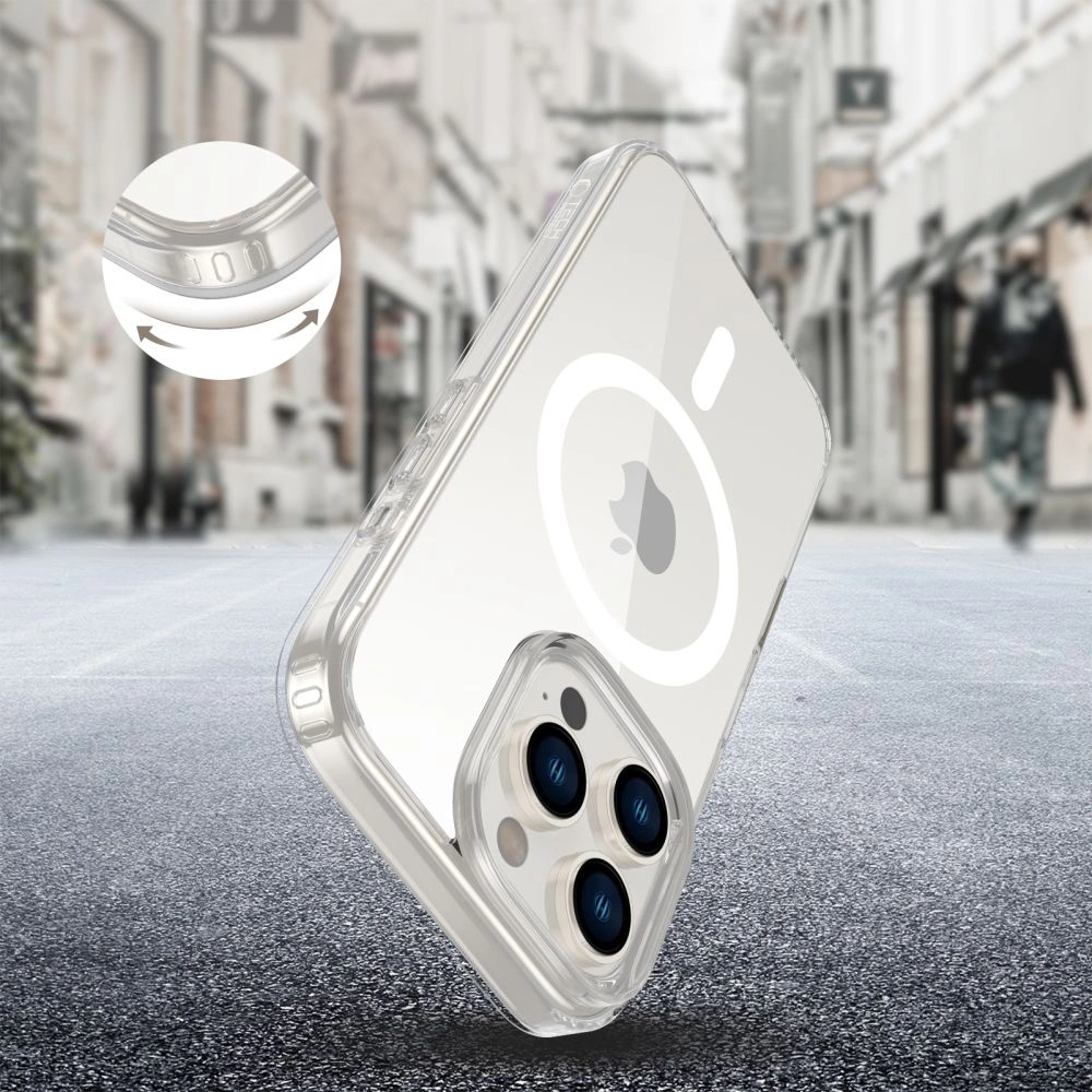 Klasyczny, jednoczęściowy case Flexair Hybrid CC Magsafe od Tech-Protect o przezroczystym wykończeniu, stworzony z myślą o podkreśleniu linii i oryginalnej sylwetki urządzenia.
