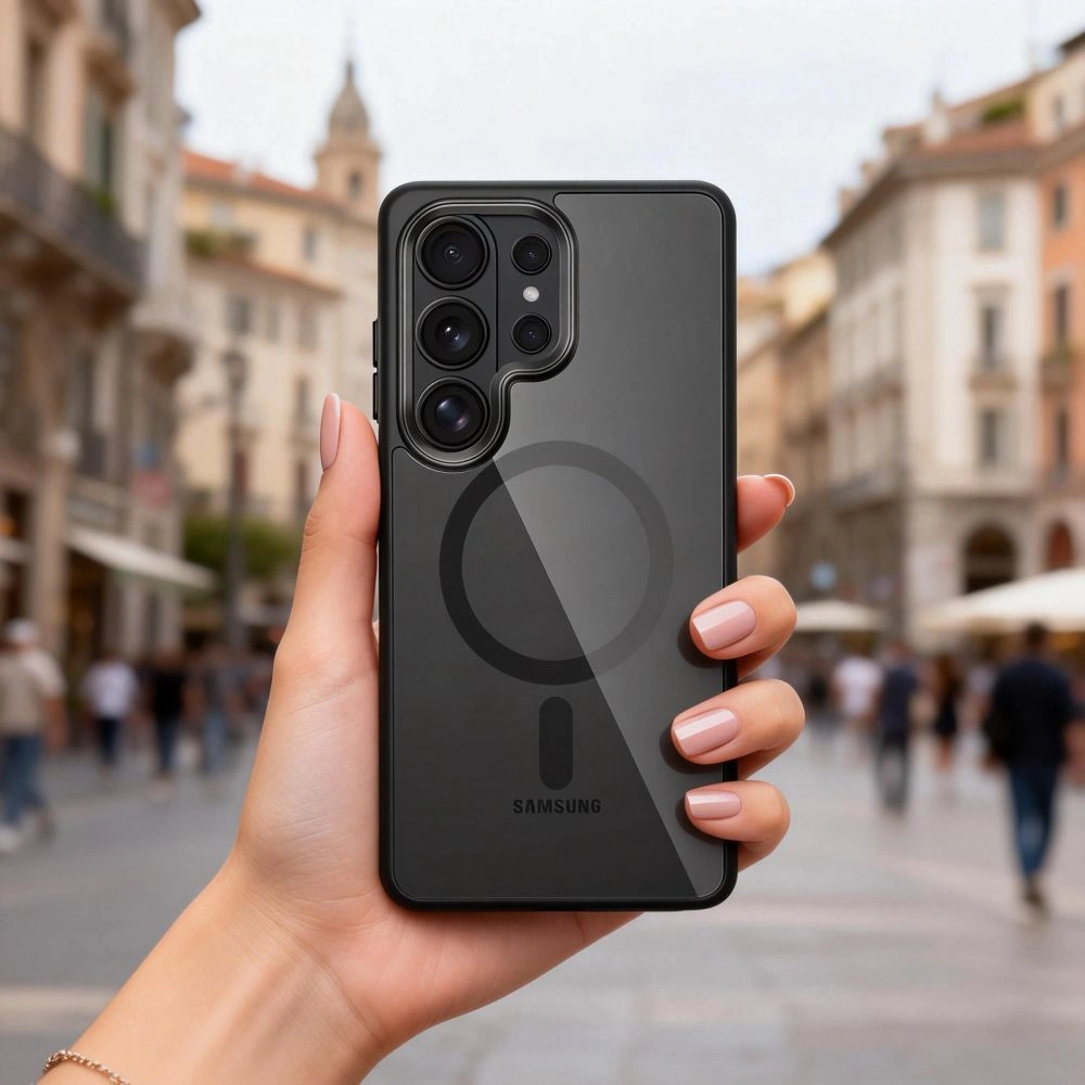 Podniesiona forma obudowy wokół aparatu i ekranu chroni najbardziej wrażliwe elementy przed kontaktem z powierzchnią płaską. Wbudowany pierścień magnetyczny zapewnia pełną kompatybilność z technologią MagSafe, umożliwiając szybkie bezprzewodowe ładowanie oraz wykorzystanie magnetycznych akcesoriów. Precyzyjne wycięcia gwarantują pełny dostęp do wszystkich portów, przycisków i głośników.