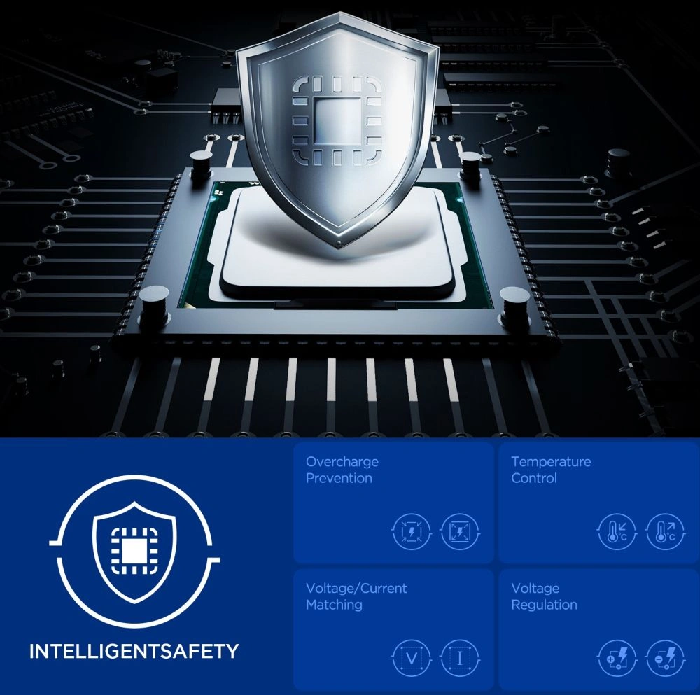 Technologia Quantum Boost automatycznie dopasowuje moc ładowania do podłączonego sprzętu, maksymalizując jego wydajność. Wbudowane funkcje Overcharge Prevention, Voltage Matching i Voltage Regulation chronią urządzenia przed przeładowaniem, nadmiernym napięciem i niestabilnym prądem, zapewniając bezpieczne i stabilne ładowanie w każdych warunkach.