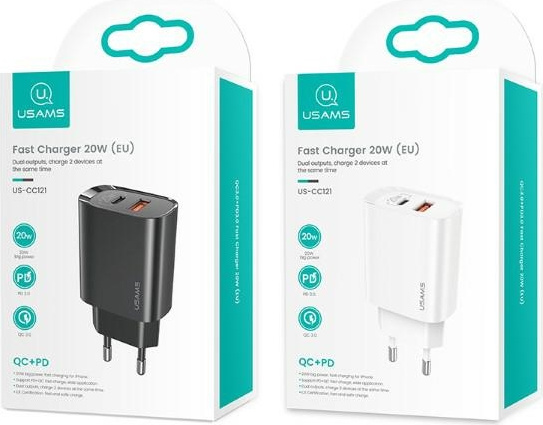 USAMS T35 US-CC121 20W to ładowarka sieciowa z szybkim i stabilnym ładowaniem, wyposażona w dwa porty: USB-C PD3.0 Fast Charging i USB Quick Charger